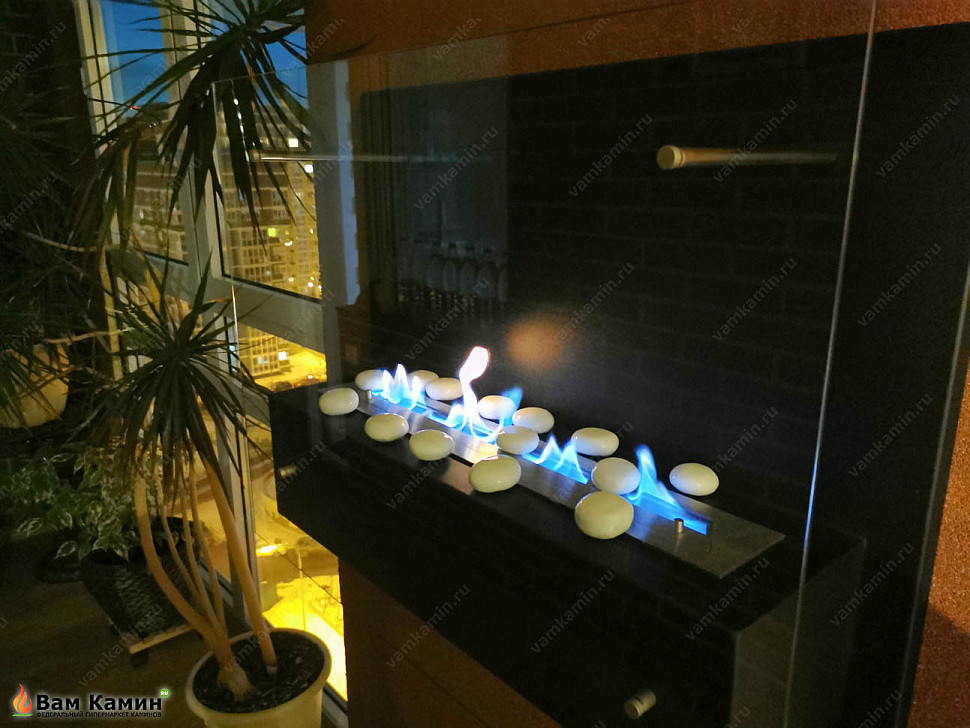 Биокамин AMBER относится к напольным биокаминам, но может также подвешиваться к стене. Именно так поступили хозяева с этим биокамином. Спереди такой экокамин защищен надежным закаленным стеклом. Сам корпус у такого аппарата цельносварной. Он выполнен из антикоррозийной стали и покрыт огнеупорной порошковый краской. Линия огня по длине равна 60 см. Поэтому этот биокамин может и обогреть помещение, и создать приятную интимную атмосферу.